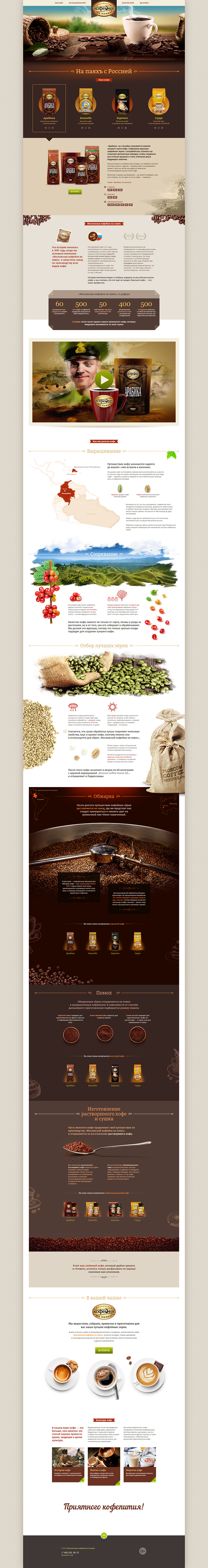 Сайт в красках показывает процесс производства кофе, знакомит читателей с историей этого напитка и предлагает попробовать различные рецепты его приготовления, попутно раскрывая ассортимент «Московской кофейни на паяхъ».